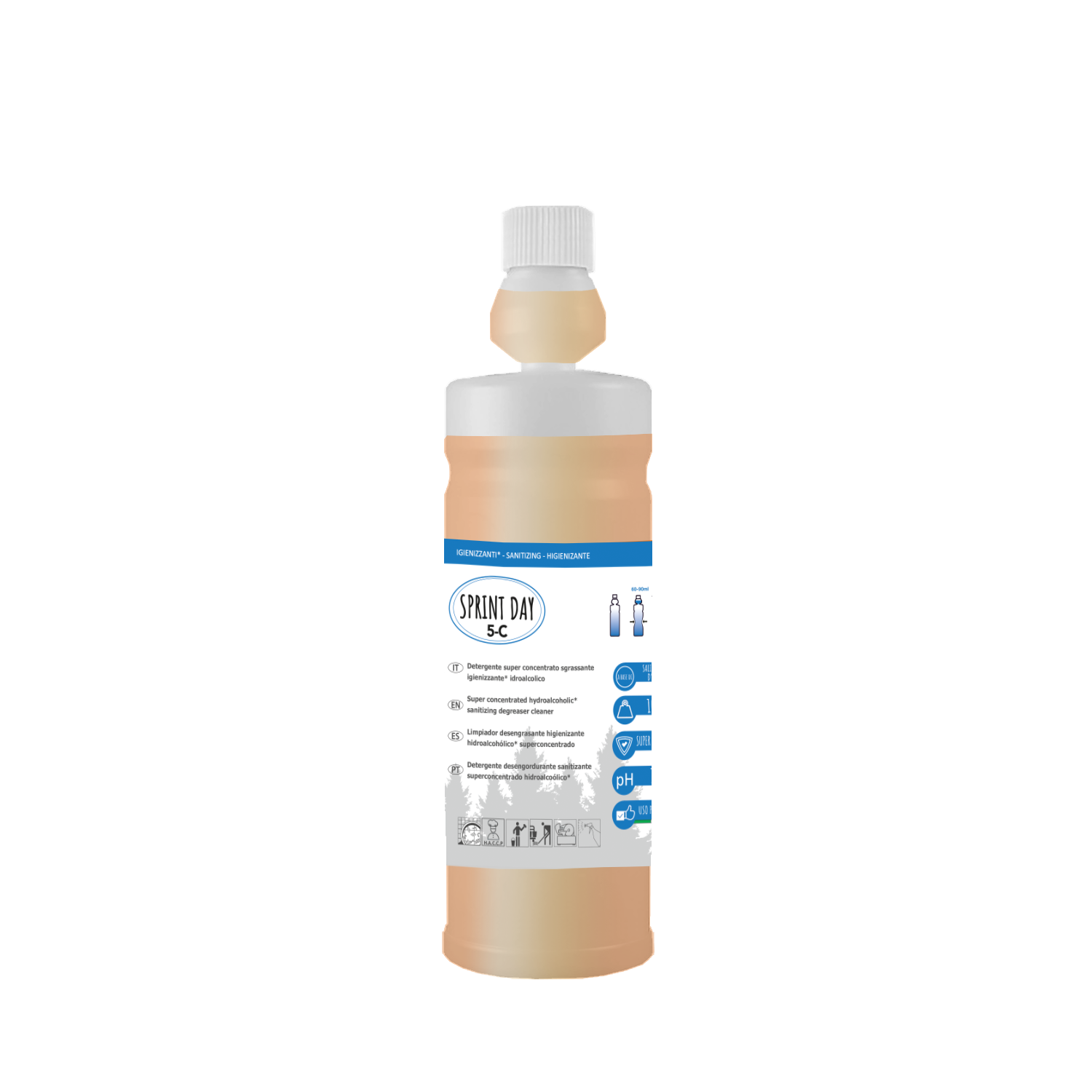 SPRINT DAY 5-C is a degreasing detergent with a sanitizing action thanks to the synergy between quaternary ammonium salts and polybiguanide hydrochloride. Sanitizing agents offer a wide spectrum of action suitable on various synthetic and natural hard surfaces. It is used in the agro-food industry, in catering, in hospitals and communities, as well as in office environments on desks, work surfaces. Good ability to remove light oils, greases, inks, fingerprints. Fast evaporation and drying thanks to the alcoholic component of the formulation. SUITABLE HACCP
