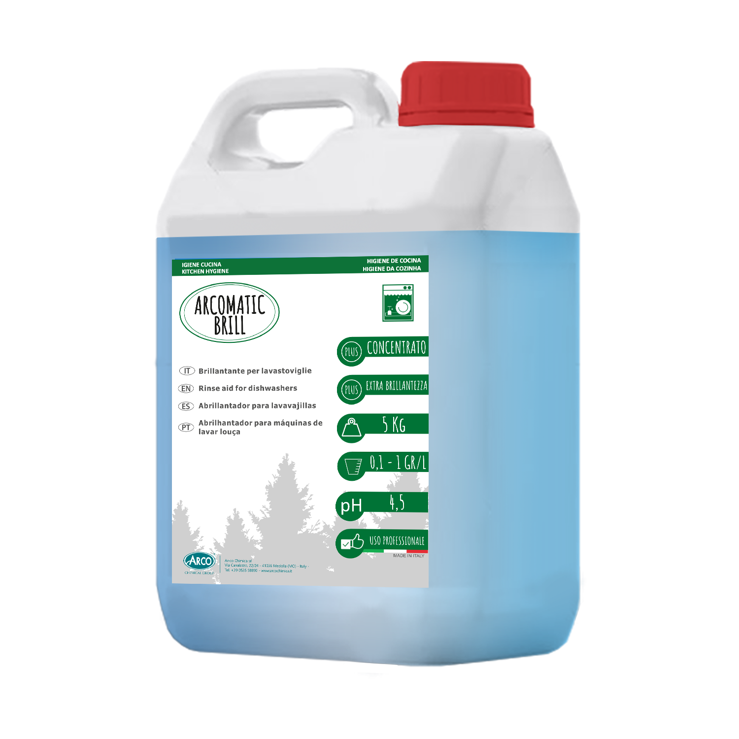 ARCOMATIC BRILL EXTRA is a concentrated rinse aid detergent with a strong active content of etho-propoxylated alcohol, specific for reducing foam. It ensures fast drying during the rinsing phase of the dishes, and is suitable for all types of water hardness.