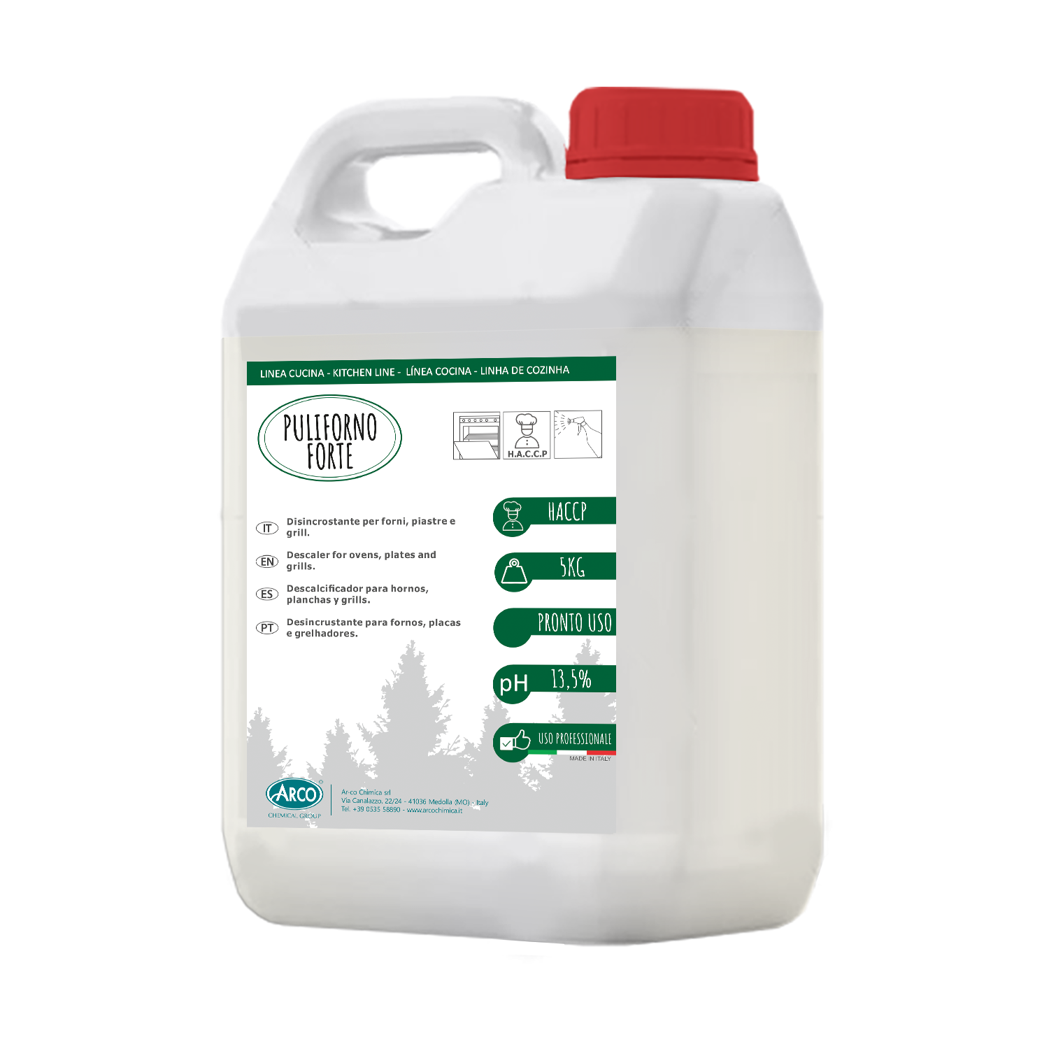 Descaling detergent with high degreasing power for an effective removal of carbon residues and greasy incrustations from ovens, grills, kitchens, cooking plates. DO NOT USE ON ALUMINUM OR TIN IRON. SUITABLE FOR HACCP.