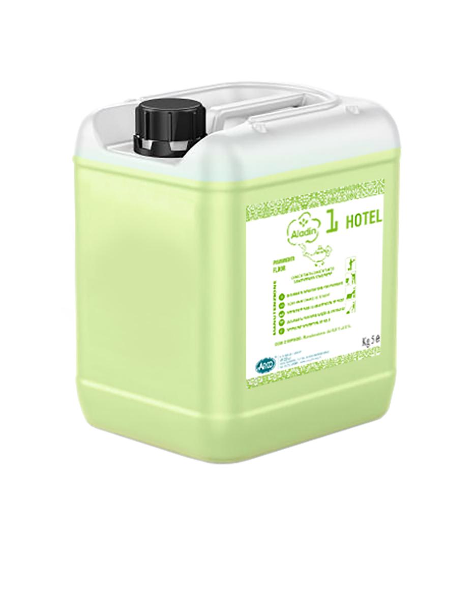 Aladin 1 pavimenti hotel è un detergente concentrato per la manutenzione di tutte le superfici e di pavimenti anche protetti con cere autolucidanti, non necessita di risciacquo.