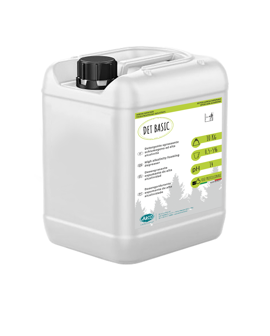 DET BASIC è un detergente sgrassante schiumogeno ad alta alcalinità indicato per la pulizia radicale di impianti di lavorazione. Indicato per la rimozione di grassi animali e vegetali, in particolare nelle industrie alimentari conserviere, mense, cucine, officine etc. E’ utilizzabile per sgrassare pavimenti, interni di celle frigorifere, contenitori portarifiuti, piani di lavorazione ecc… Utilizzabile anche nelle industrie del vino e delle bevande.