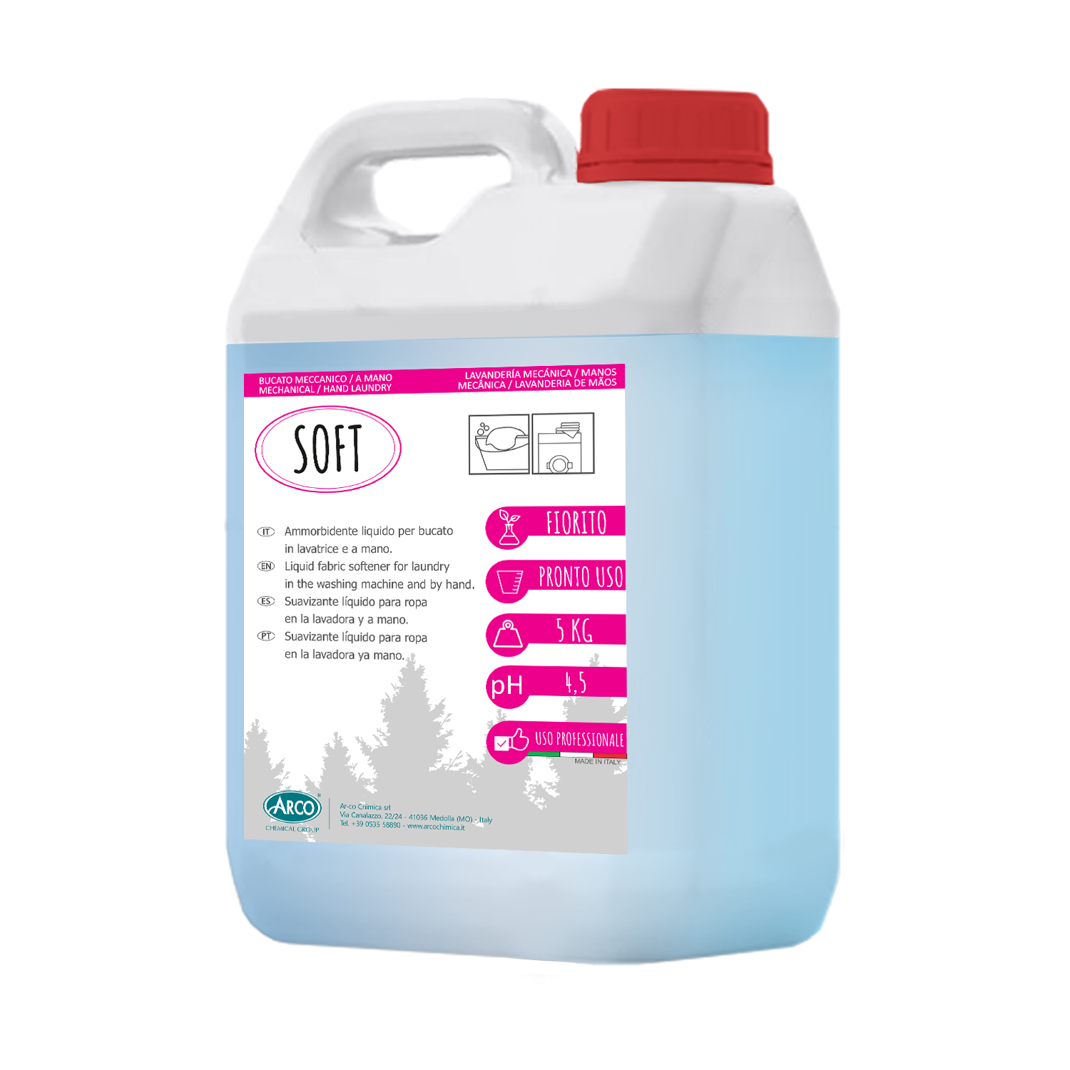 SOFT è un ammorbidente liquido per bucato a mano e per impianti lavabiancheria, ideale per ogni tipo di tessuto. Facilita la stiratura e lascia sul bucato un fresco profumo di pulito alla nota fiorita.