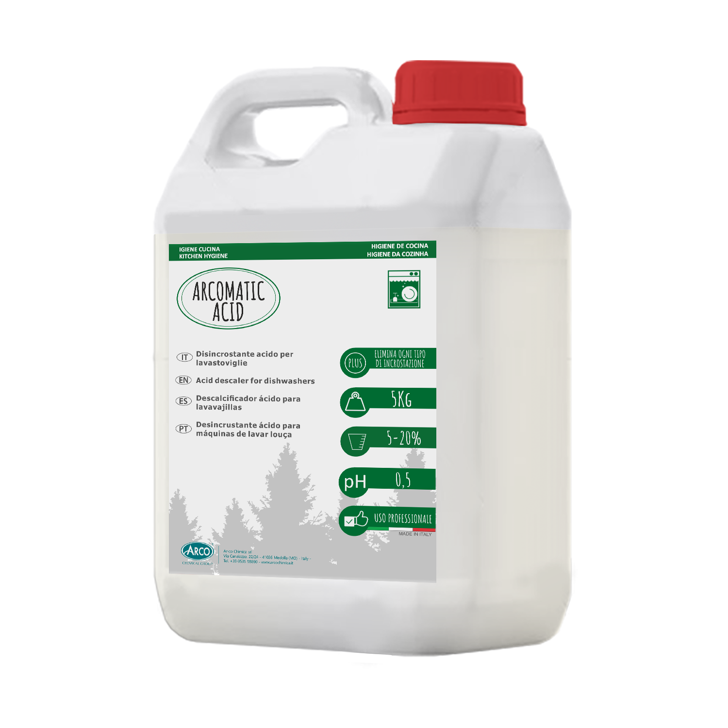 ARCOMATIC ACID è un disincrostante da usare periodicamente nelle macchine lavastoviglie e nei boiler.