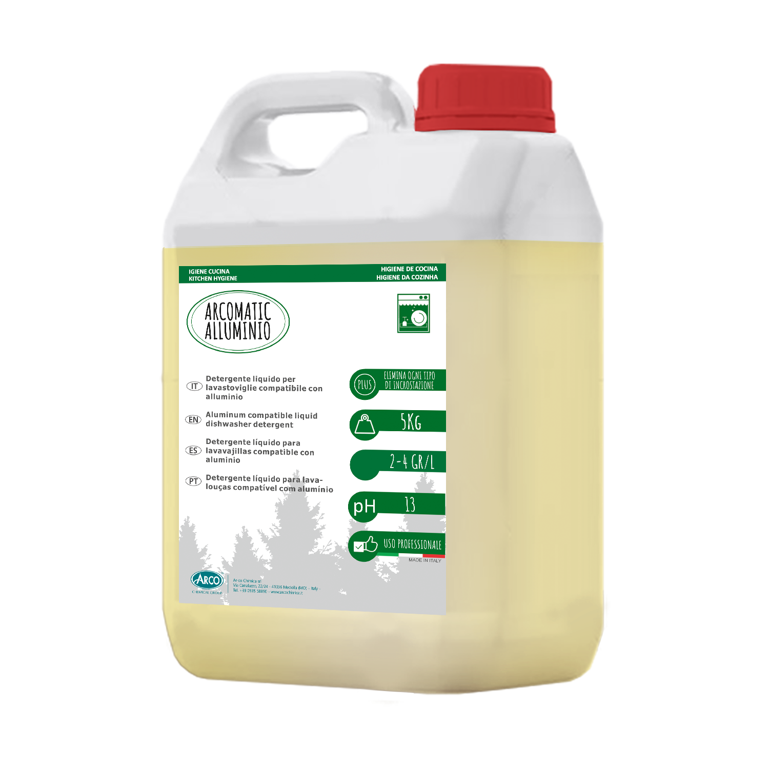 ARCOMATIC ALLUMINIO è un detergente a moderata alcalinità appositamente studiato per la pulizia di stoviglie e pentolame in alluminio. E’ idoneo per qualsiasi durezza dell’acqua ed è privo di cloro, grazie alla formulazione alcalina bilanciata garantisce una buona resa di pulizia delle stoviglie trattate.