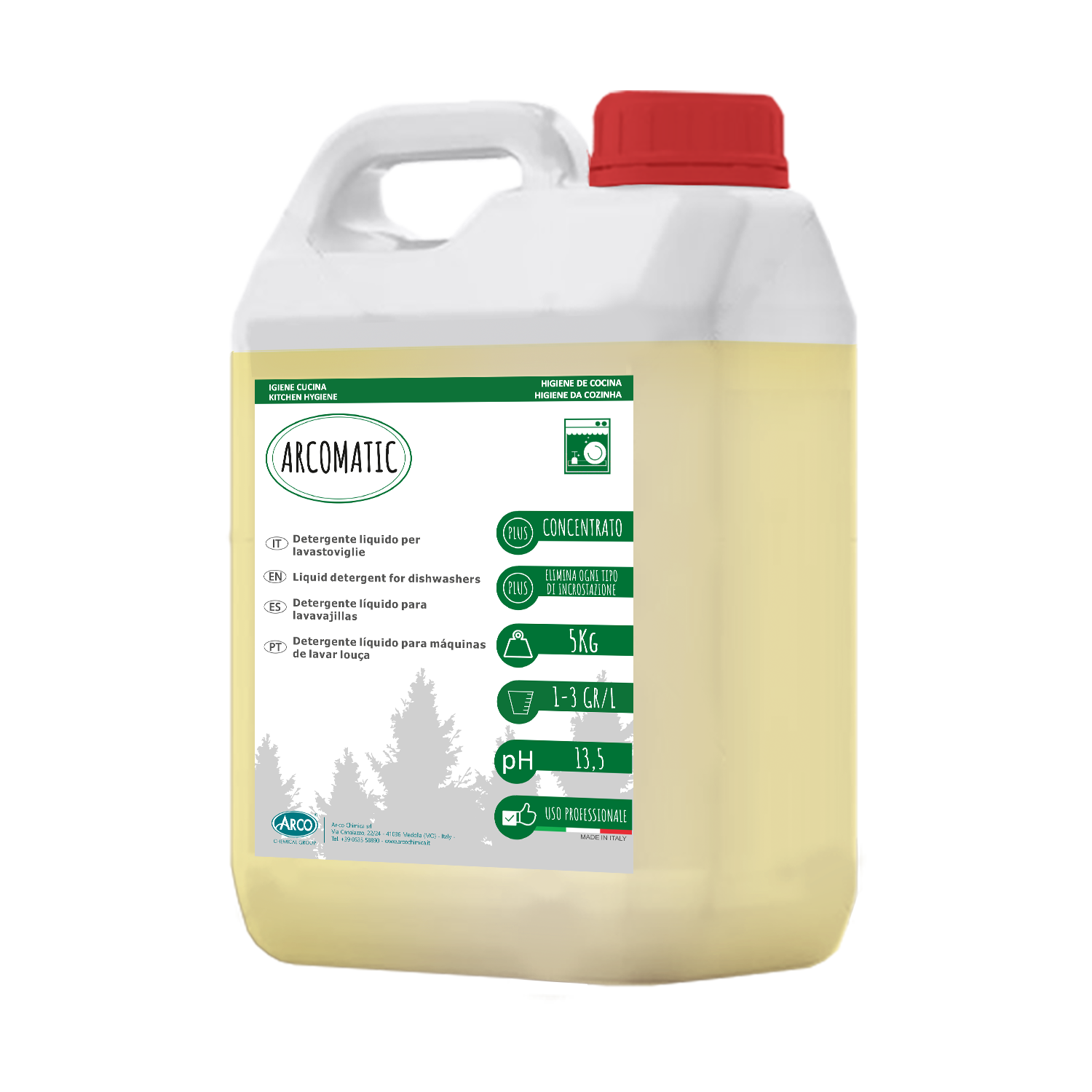 ARCOMATIC è un detergente ad alto contenuto di alcalinità, non schiumogeno, ideale per qualsiasi impianto lavastoviglie di tipo industriale. Grazie al suo alto potere sequestrante rimuove lo sporco alimentare da pentolame, bicchieri e vetrerie in genere.