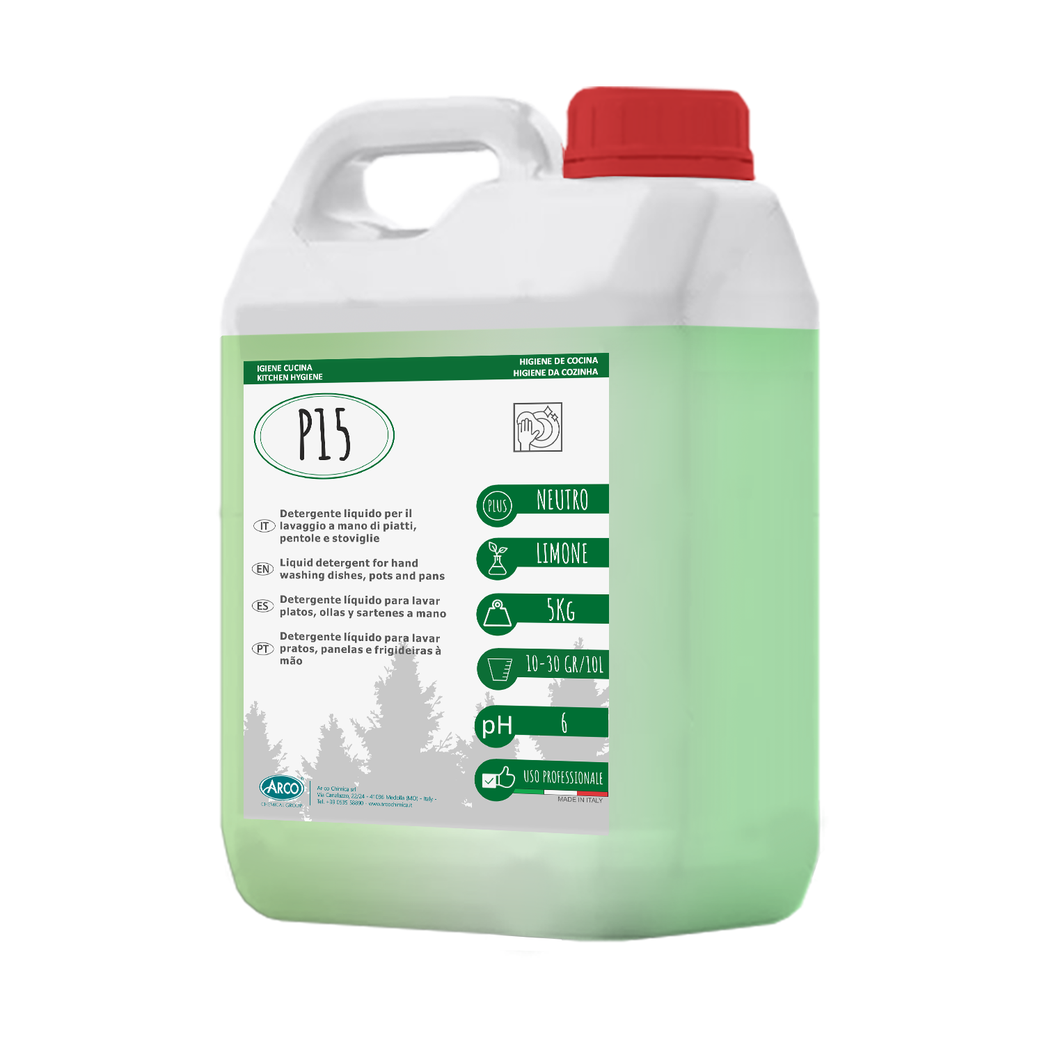 P15 è uno sgrassante neutro per il lavaggio manuale delle stoviglie, ad elevata formazione di schiuma, per rimuovere ed eliminare grasso e residui di cibo anche disseccati. Profumato con essenza agrumata.