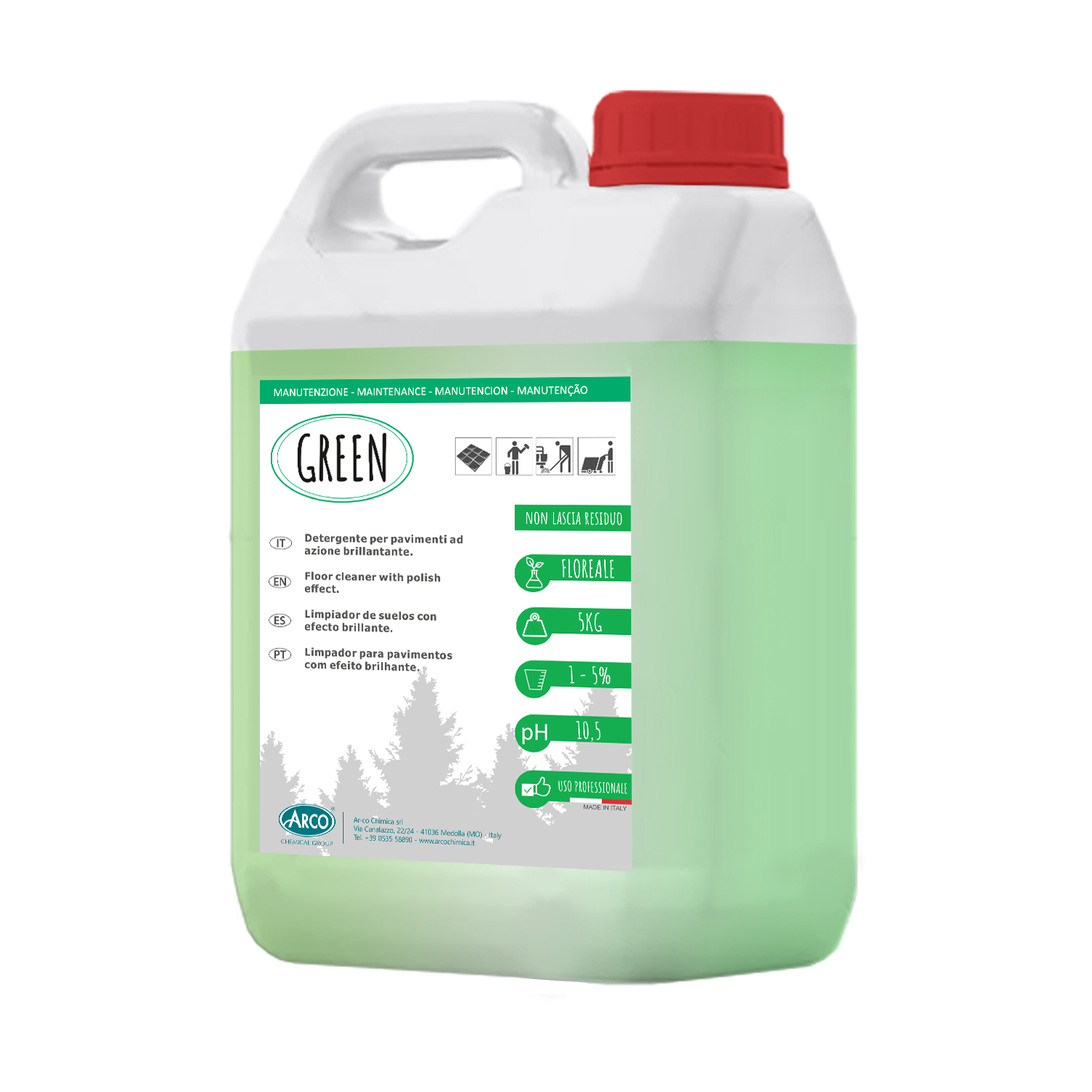 GREEN è specifico per la pulizia ordinaria di pavimenti e di tutte le superfici lavabili. E’ particolarmente indicato per la manutenzione giornaliera di superfici lucide quali pavimenti in ceramica e lucidati a piombo inoltre è il prodotto ideale per la manutenzione a umido di pavimenti protetti con emulsioni polimeriche. Lascia nell’ambiente un persistente profumo floreale. Effetto antistatico.
