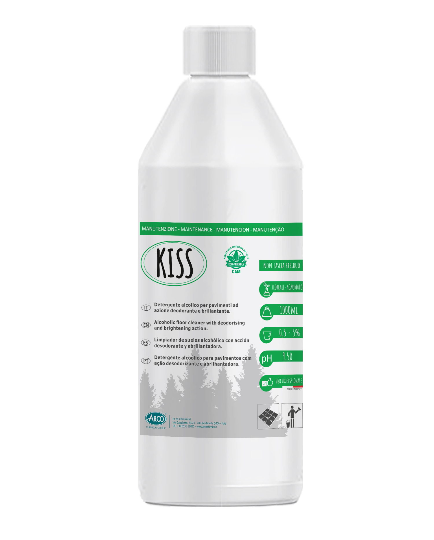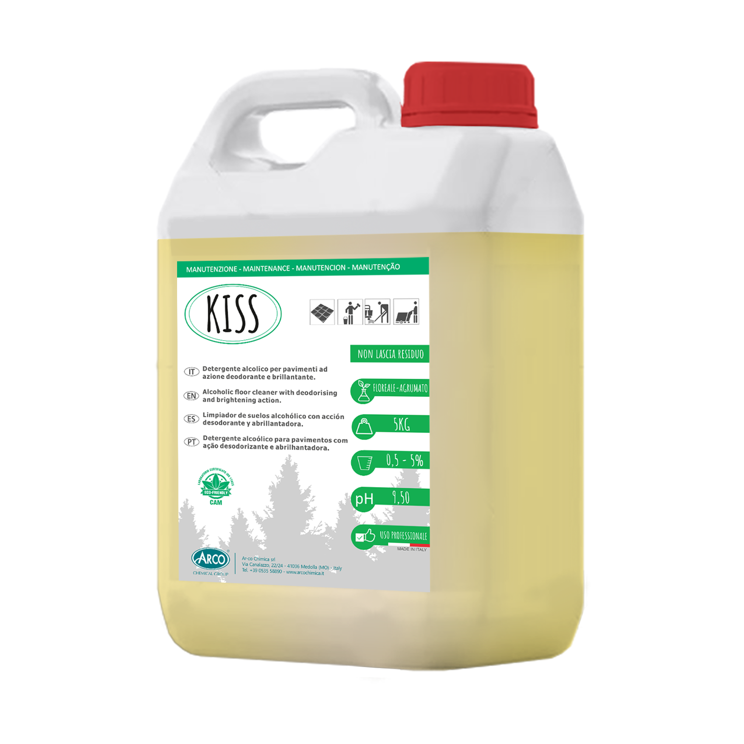 KISS è un detergente a base alcolica ad azione brillantante e deodorante. Grazie alla totale assenza di residui è particolarmente indicato per la manutenzione di tutte le superfici lavabili, in particolare delle pavimentazioni lucide, quali ceramiche, grès porcellanato lucido, pavimenti vetrificati e marmi lucidati a piombo, parquet verniciati, pavimenti galleggianti. Profumazione agrumata.