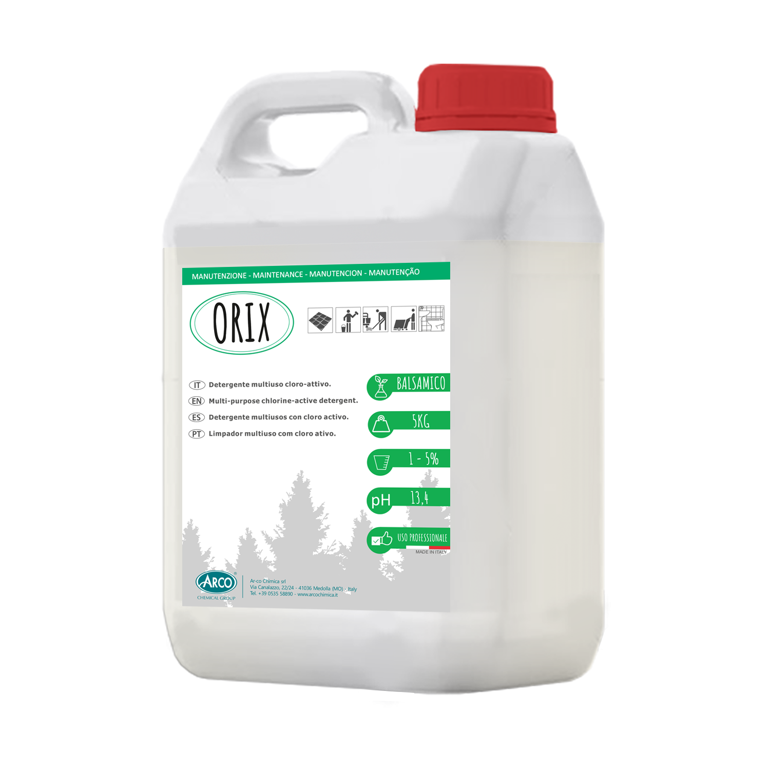 E’ un detergente multiuso ad azione candeggiante idoneo per la pulizia di manutenzione di superfici dure. E’ particolarmente adatto al trattamento di pavimenti, piastrelle, superfici in maiolica e servizi igienici ed è idoneo per la pulizia di lavelli, vasche da bagno, bidet e l’interno della tazza wc. L’elevata capacità ossidante dell’ipoclorito di sodio combinata ai tensioattivi conferiscono al prodotto una particolare adattabilità a vari tipi di sporco, rendendolo utile per la pulizia quotidiana e l’igienizzazione delle superfici dure. Azione anti-micotica. Gradevole nota balsamica/canforata.