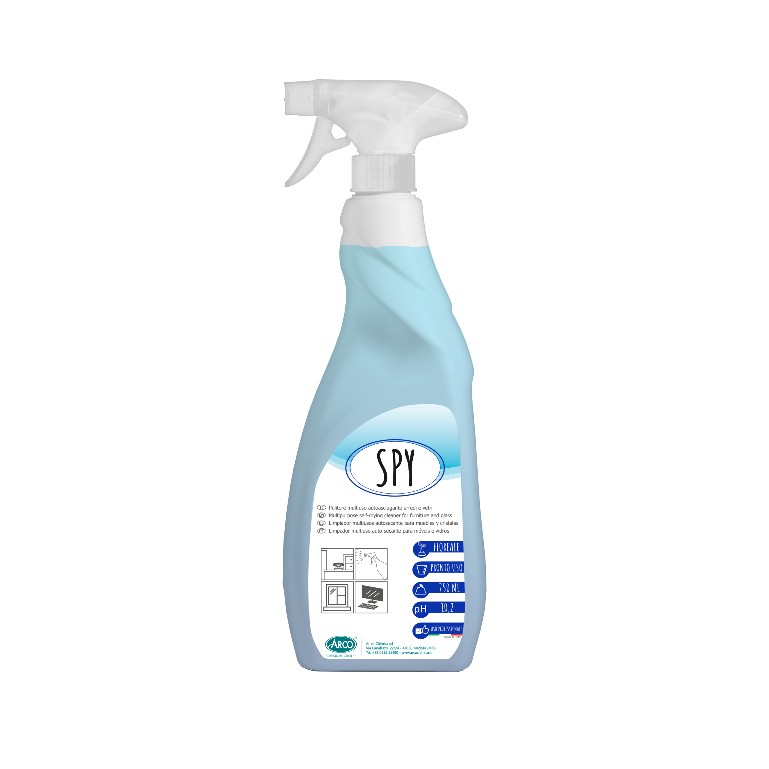 SPY è un detergente per la pulizia giornaliera di vetri, specchi e cristalli, asciuga rapidamente senza lasciare tracce o aloni. E’ ideale anche per lo spolvero delle superfici laccate o del mobilio. Ha profumazione floreale.