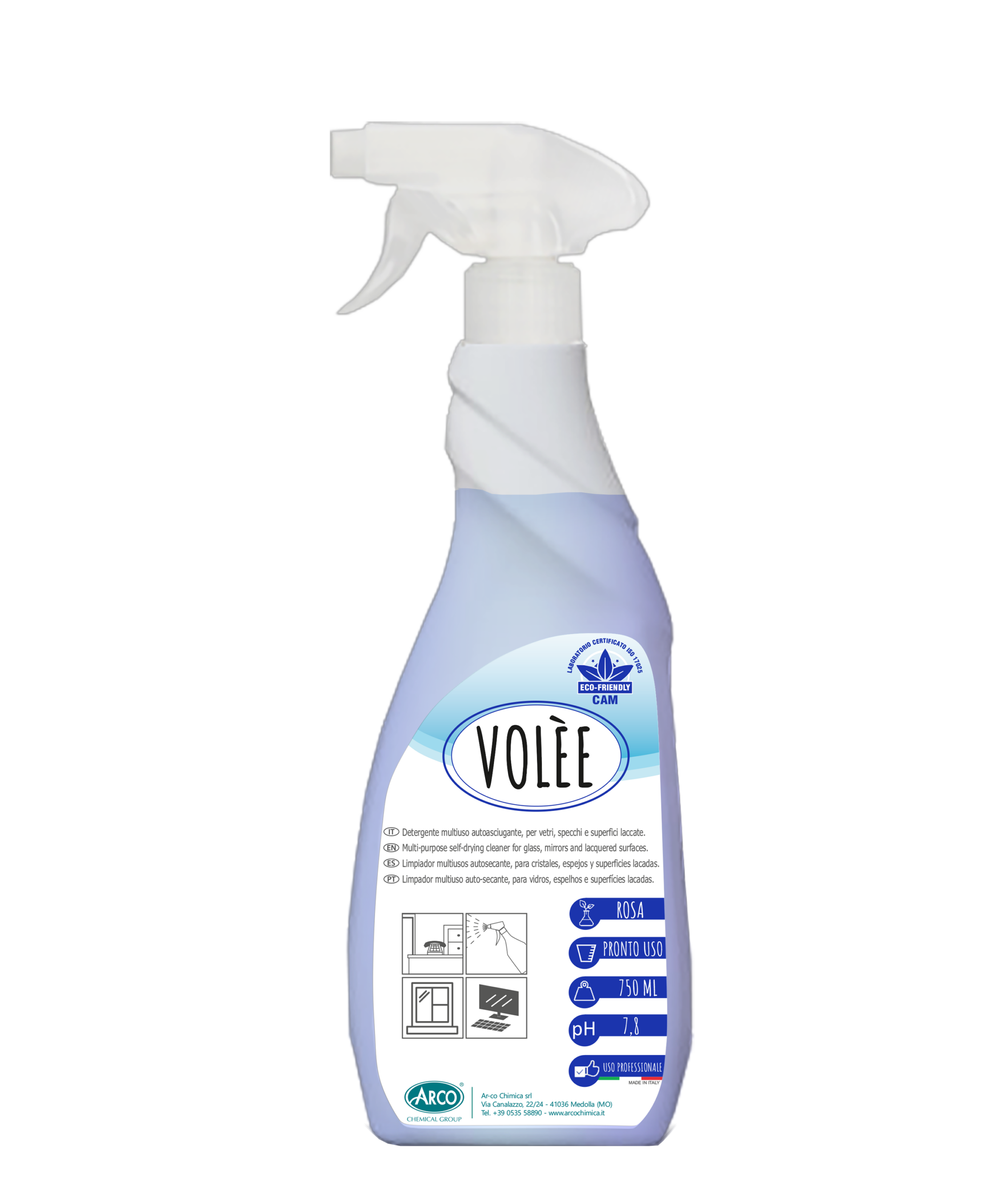 E’ un pulitore rapido multiuso per la manutenzione giornaliera di scrivanie, banchi di scuola, vetri, specchi, porte e superfici laminate e laccate in genere. Elimina aloni ed untuosità insieme a segni di biro, matita, timbri, colori e pennarelli. Può essere utilizzato anche su superfici metalliche quali ottone, ghisa, cromature, acciaio ed alluminio. Grazie all’attenta formulazione è a residuo nullo, eliminando problemi di aloni e striature. L’apposita profumazione di rosa esotica rende gradevole l’uso di VOLÉE. Non necessita risciacquo