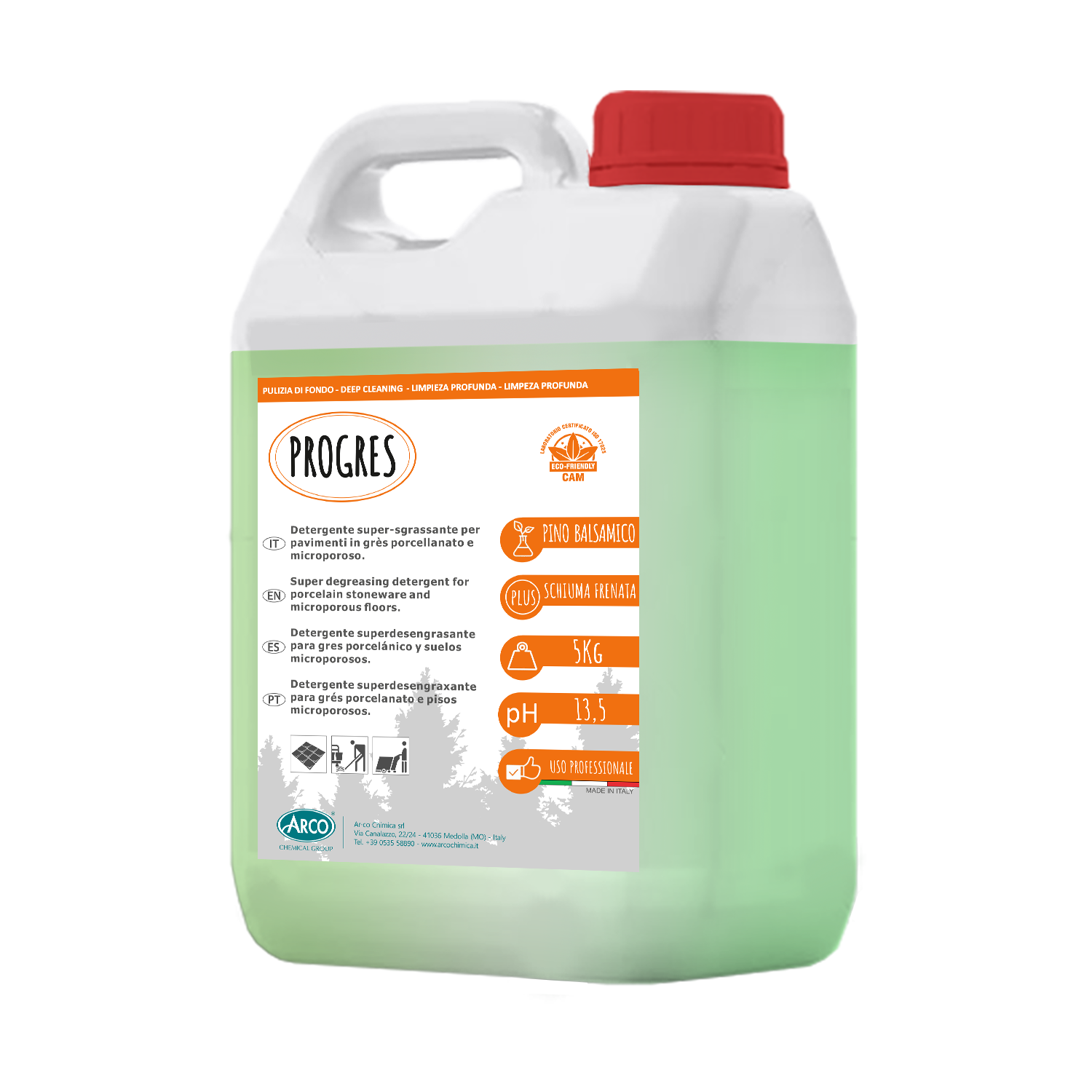PROGRES è un super-sgrassante a schiuma controllata indicato per pavimenti in grès porcellanato e microporoso. PROGRES rimuove con facilità lo sporco grasso organico e minerale anche vecchio, pulendo e sbiancando la mattonella anche in profondità . La manutenzione giornaliera consente di mantenere il colore originale del grès porcellanato impedendone l’ingrigimento.