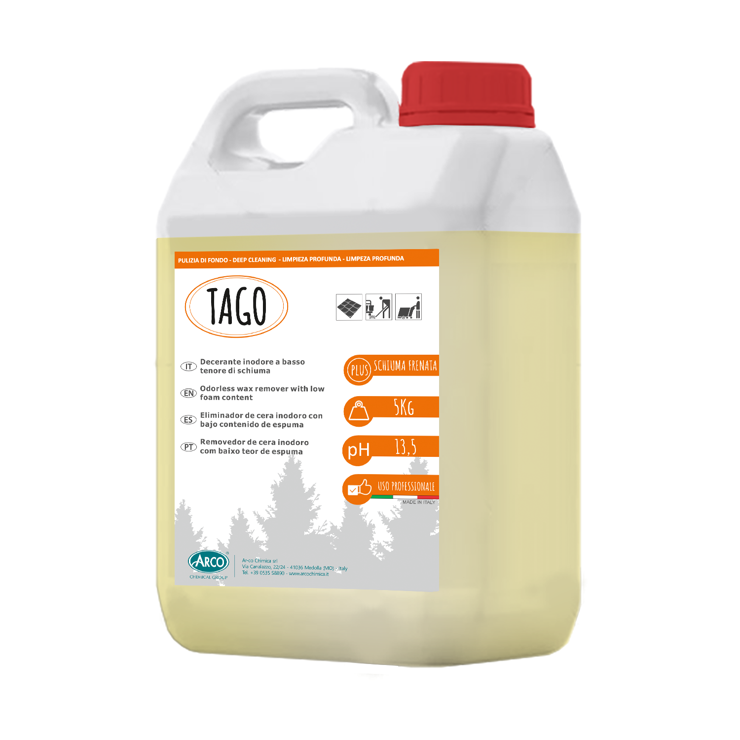 Tago è un decerante concentrato particolarmente indicato per rimuovere vecchi strati di cera metallizzata da pavimenti resilienti come: PVC, linoleum, pietra e gomma, ecc.. L’efficacia di TAGO ne permette l’utilizzo anche in punti non raggiungibili con macchine quindi angoli, scale ect.. Agisce in pochi minuti.